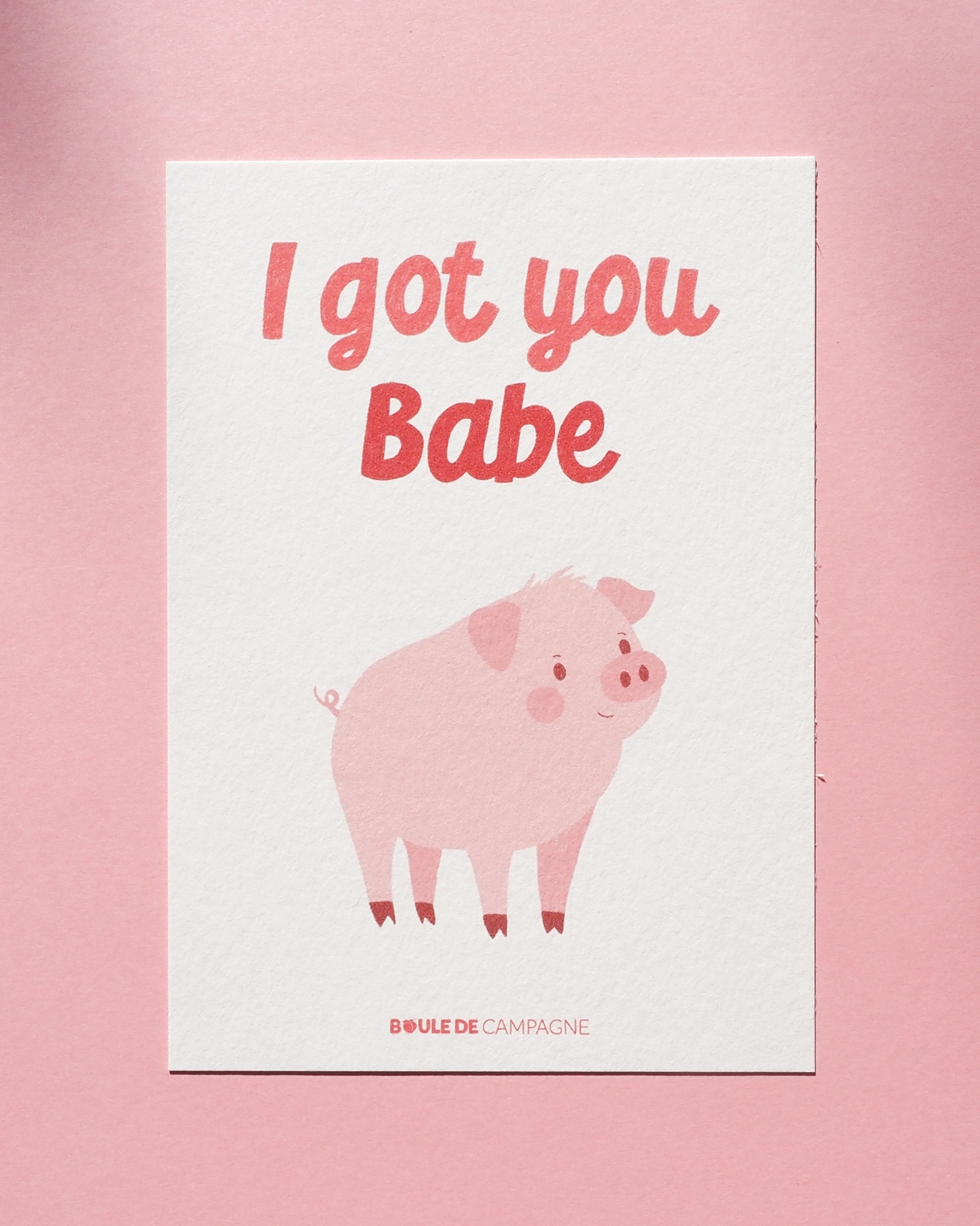 Avec son message “I got you babe”, cette illustration met en scène un cochon attendrissant, symbole de proximité et de lien affectif.
