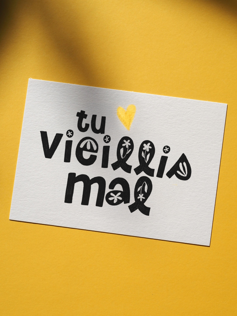 Avec son message “tu vieillis mal”, cette création joue sur un ton direct, presque irrévérencieux, adouci par une illustration florale délicate.